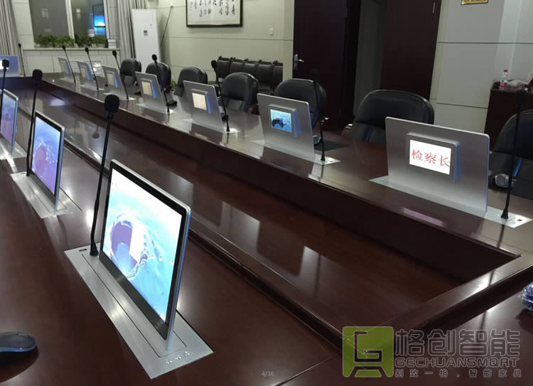 無紙化會議系統由液晶顯示屏升降器系統、電腦終端系統、顯示系統組,可實現一系統雙用。召開普通會議討論時,顯示器降至桌面平整整潔;召開案件討論時,顯示器升至指定位置,用于進行案件信息的多屏顯示。此外,通過升降會議系統軟件,可按需實現案件材料的單屏、多屏傳輸,同步異步顯示,多媒體輸出,靈活實用。目前,這套無紙化會議系統已投入使用,并且運行正常,在節能環保的同時,提高了會議效率。
