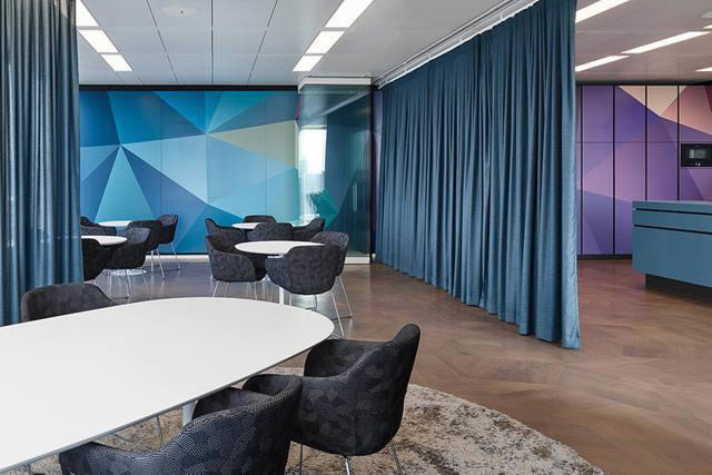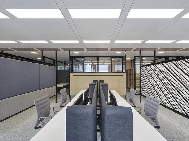 這些工作社區紛紛與被稱為“市場空間”的交流中心樞紐相連。綠色蔥蘢的圖書室是寧靜沉思的好地方。裸色、水鴨色和藍色的配色方案強化了每個區域的特征。工作區的墻面、隔斷和辦公家具配色采用寧靜的色系。柔和的色調和嚴謹的圖形與材料選擇,展現出色彩微妙變化間的魅力。